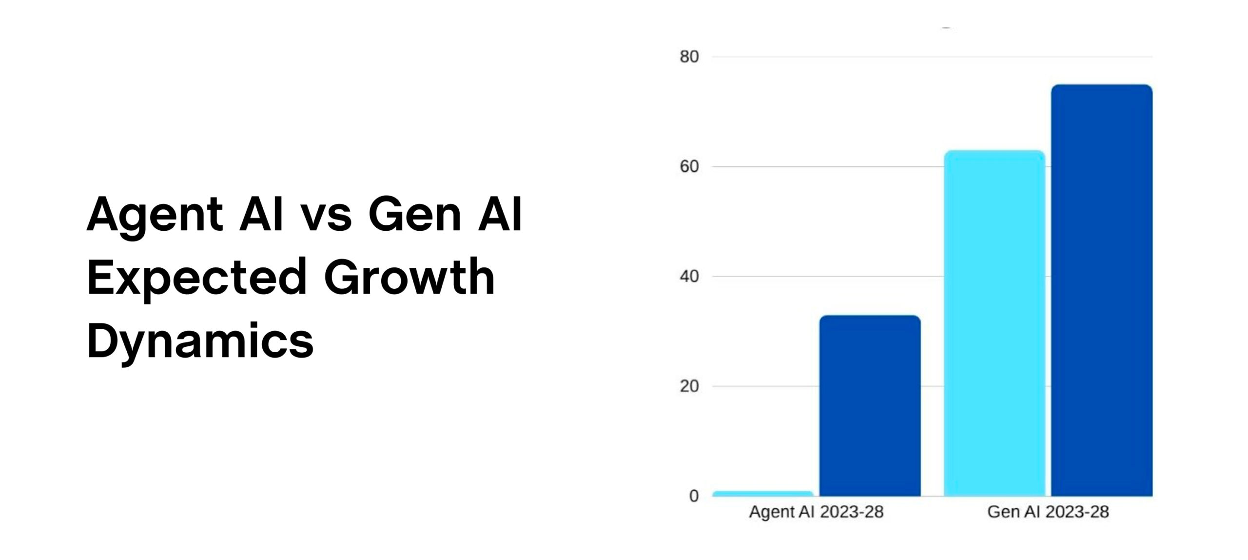 No wonder that research predicts that 33% of enterprise software applications will incorporate Agentic AI by 2028, while in 2023 this number amounted only to 1%. This growth rate is even more impressive than the one expected from generative AI adoption, as its integration rate is expected to grow from 63% in 2023 to 75% in 2028.